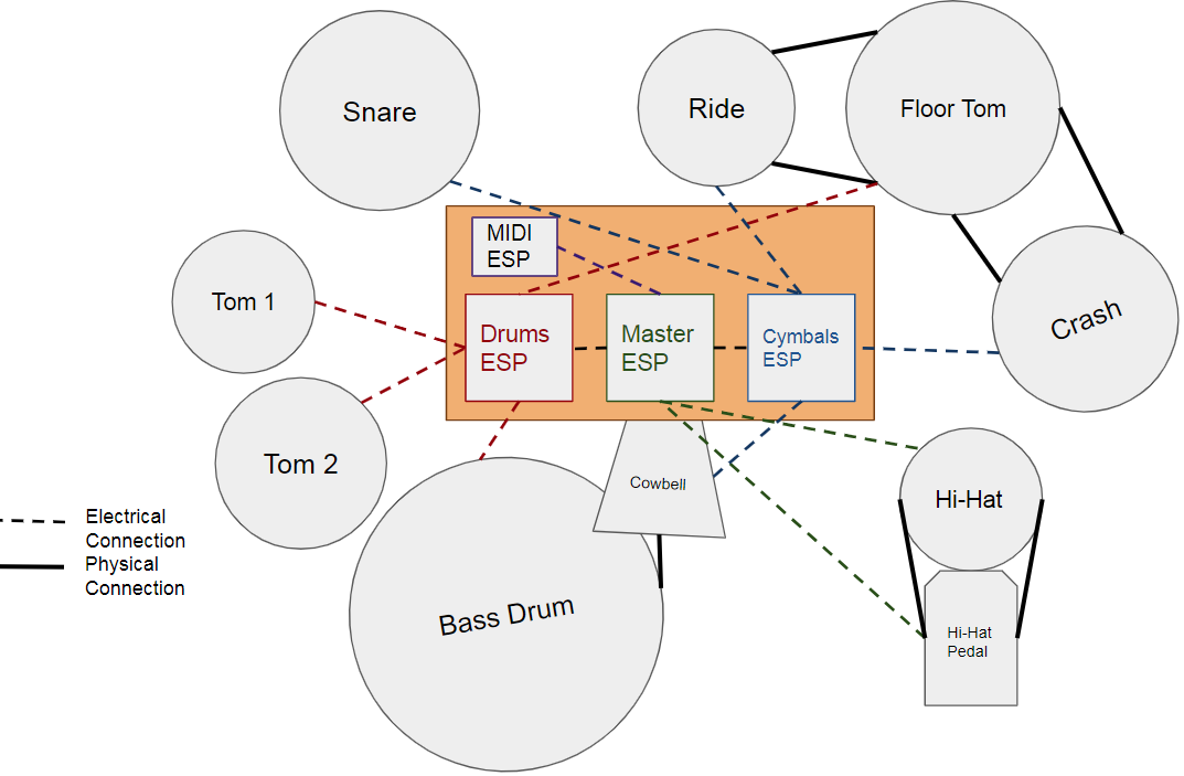 The master ESP reads the MIDI signal, further divides it, and sends it to the relevant micro-controller. The master ESP operates the pedal and stick of the Hi-hat, while the “drums” ESP controls the bass drum, floor tom, low tom, and low-mid tom, and the “cymbals” ESP controls the crash cymbal, ride cymbal, snare drum, and cowbell.
