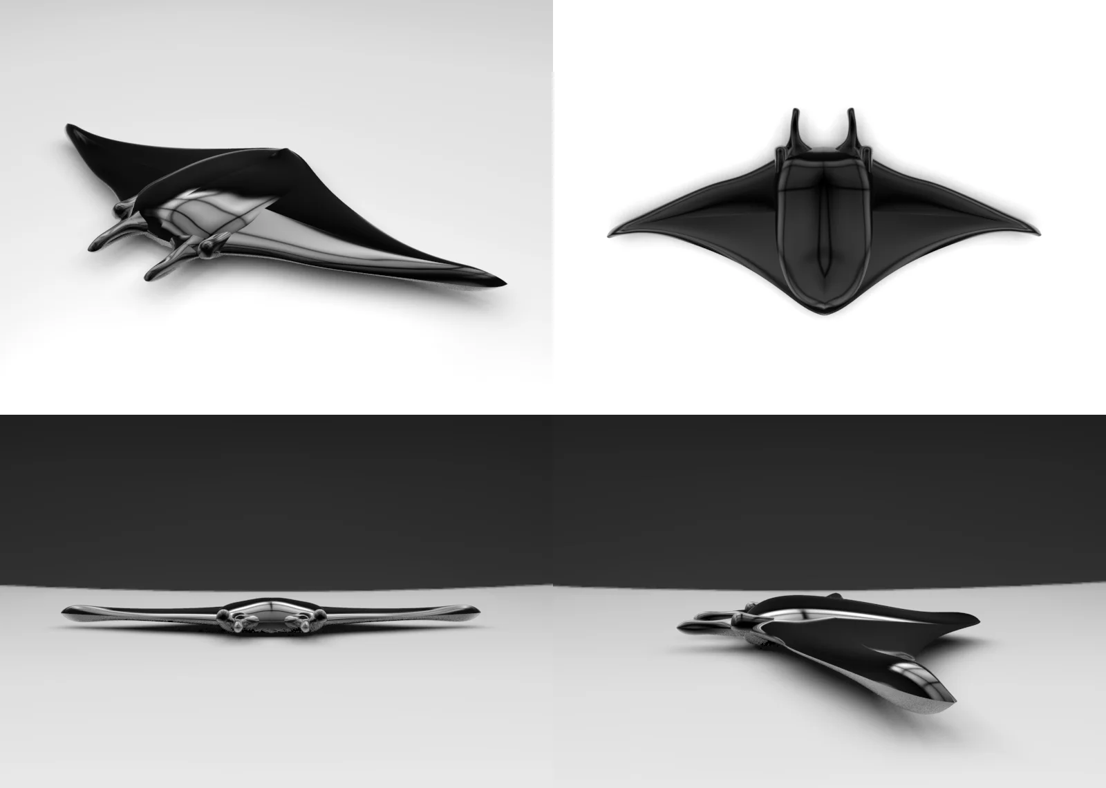 The geometry of the Manta ray designed in SolidWorks, with all the aesthetic features being surface modeled.